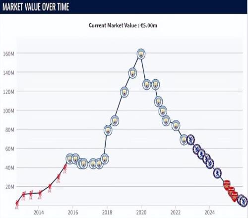 近幾年的低迷表現,也讓斯特林的身價直線下滑,在比較權威的身價網站《德國轉會市場》的最新統(tǒng)計中,斯特林的最新身價已經跌至500萬歐元。要知道在斯特林的巔峰期,身價可是達到過1.6億歐元,那時的他就是最頂級的球員之一,整個世界足壇身價比他更高的球員只有姆巴佩和內馬爾。但是在短短6年后,他的身價就足足縮水了32倍,從萬人追捧的明星,變成了無球可踢的棄子。